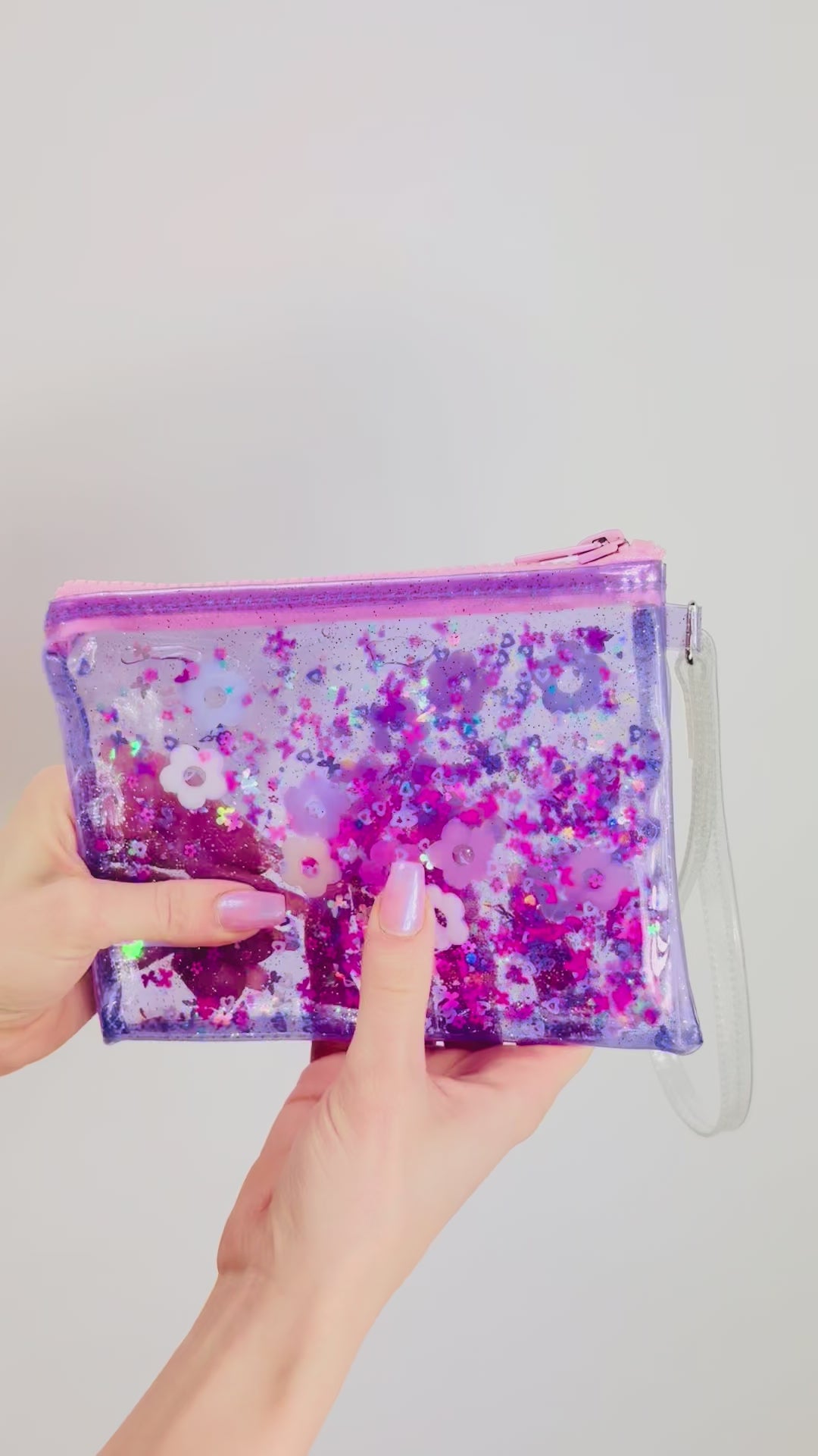 Step into your ultimate Y2K daydream with this little wristlet, inspired by childhood nostalgia and all things sparkly, soft, and magical. Made with purple sparkle vinyl, a pastel pink zipper, and a sparkle clear vinyl wristlet strap, this piece feels like your favorite early 2000s fantasy brought to life. Soft, sparkly, and full of magic, itβs a little piece of your childhood dreams you can carry with you.