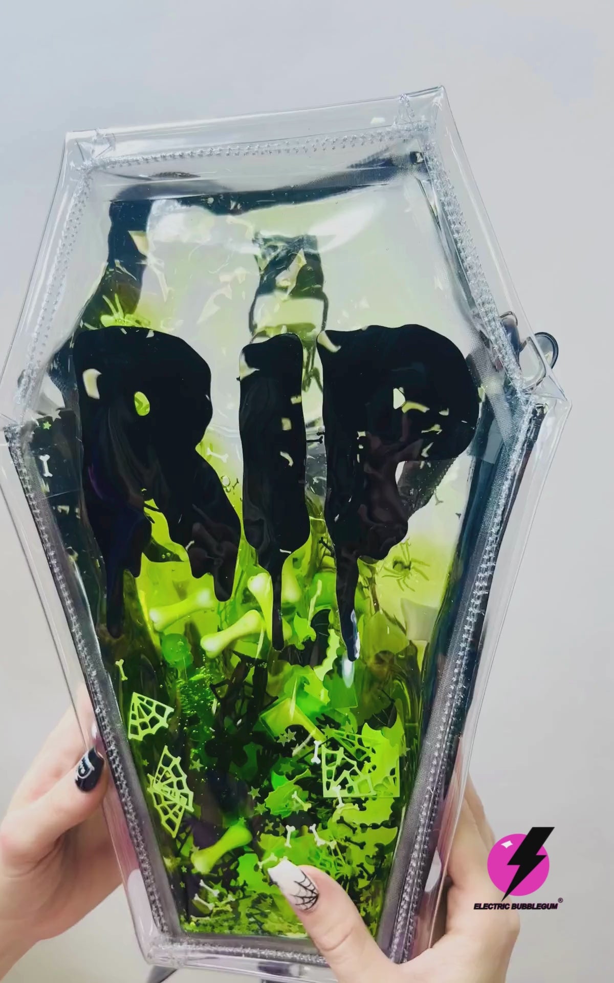 This backpack is filled with night of the living dead glitter goo!! It's shaped like a coffin and can be used as a backpack or a crossbody purse! Features glow in the dark glitter goo on the front and a glitter goo pocket on the back of the bag. Glitter goo is made up of skeletons, gravestones, bones, spiders, bats, webs and stars. Gravestones, spiders and stars glow in the dark. Backpack is made of clear and black vinyl and features a RIP across the front! Purse closes with a black zipper that has a cute little star pull. Comes with black backpack straps and a black crossbody chain strap that are all removable and adjustable.