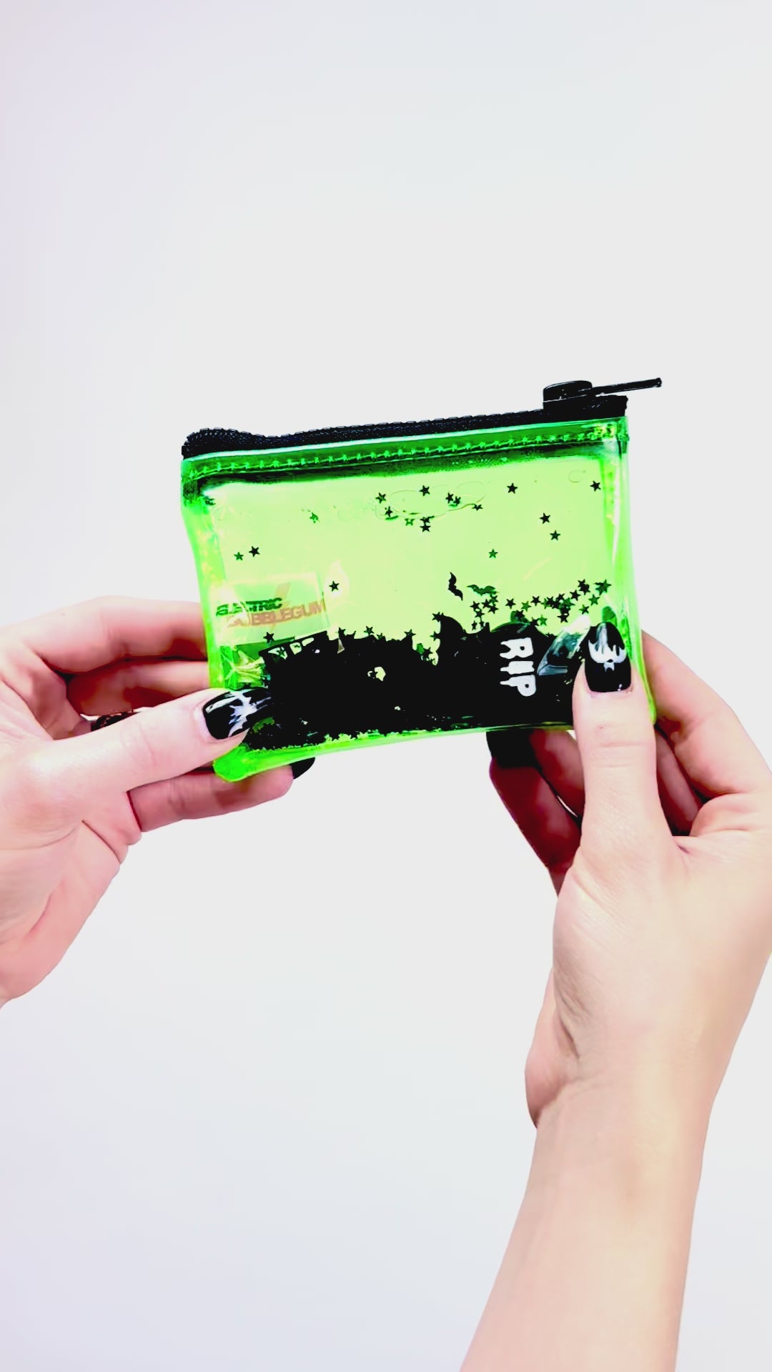 This little coin purse is perfect for all you ghouls! This wallet is neon green and filled with gravestones, webs, bats and stars floating in clear liquid providing you with endless fun moving them around! This little pouch will make the perfect small zip bag or wallet. Fits a few cards, cash and change perfectly, as well as, lip gloss, lip balm or other small items. Has a black plastic zipper.