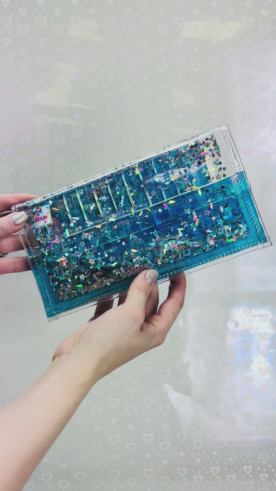 Bring a bold digital sparkle to your everyday carry with the Glitter Glitch Large Wallet. Clear vinyl on the outside showcases a shimmering liquid glitter mix made up of silver and blue holographic glitter. Stars, clouds, lightning bolts, and hearts drift through the wallet with every movement, giving it a lively, glitchy glow that feels straight out of a cyber-inspired world. Inside, the card slots are lined with blue holographic digital vinyl for an extra touch of futuristic style.