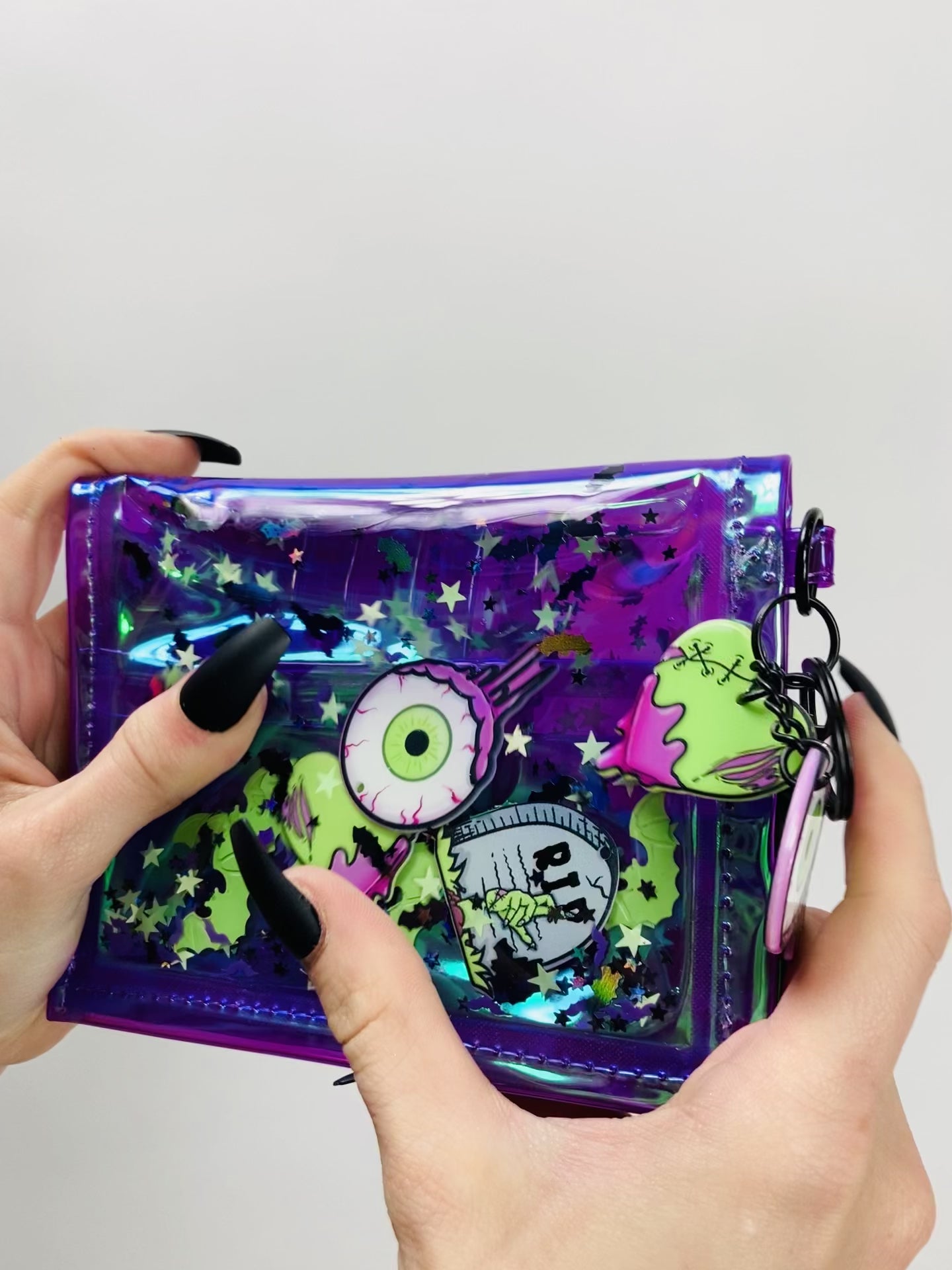 Feeling spooky? This is the wallet for you! It is filled with cute monster charms, stars and bats that float around in clear liquid. Enjoy endless fun moving the glitter and liquid around on the front and back of the wallet. This wallet has 5 card slots and 3 wider slots for cash and anything else! It is made of durable purple iridescent vinyl and has a snap closure. Wallet also features a cute eyeball and heart charm and keychain hook on the side.