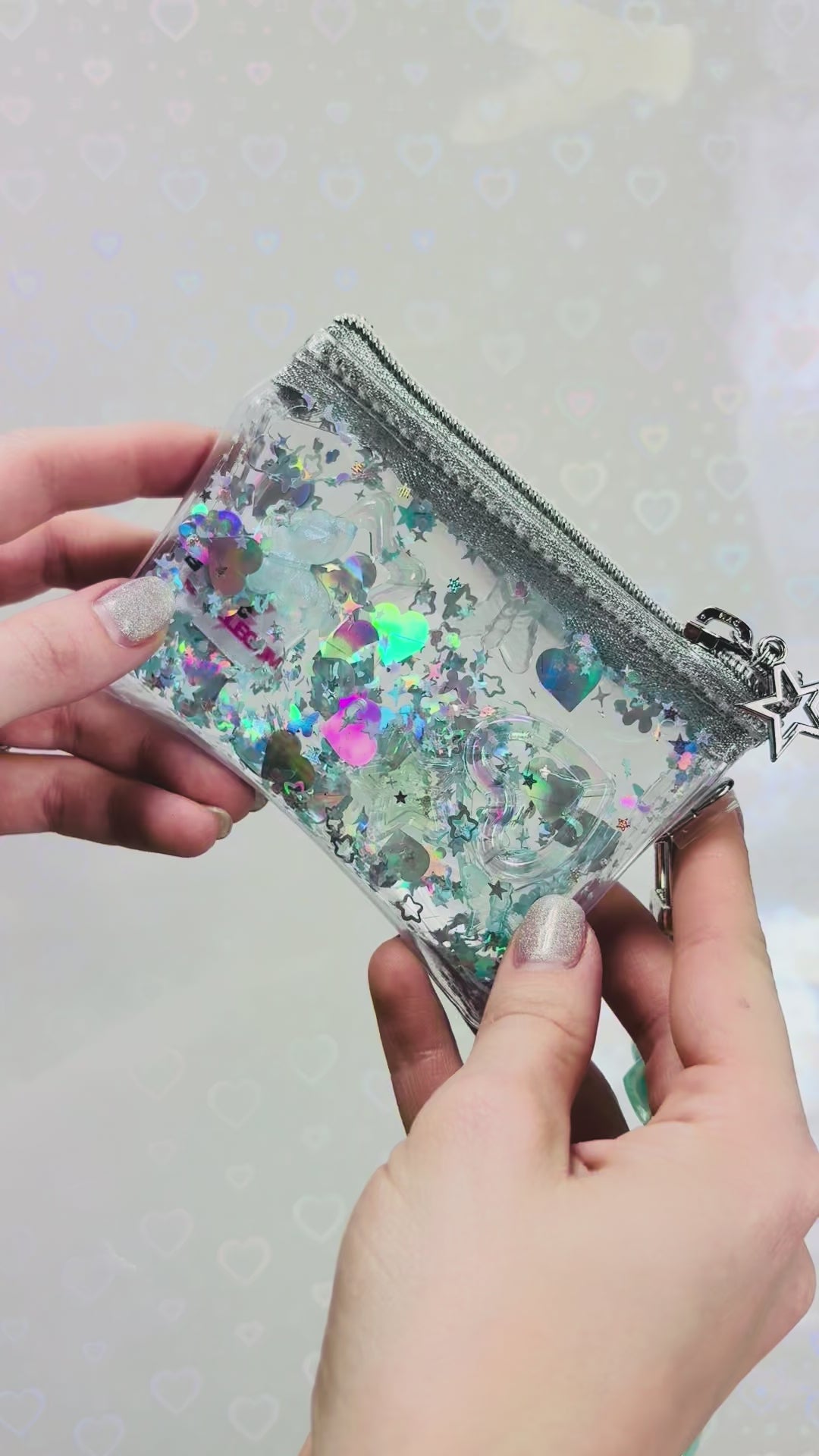 Small, sparkly, and totally crush-worthy, this Cyber Crush Coin Purse is made for your cutest keepsakes. Made from glossy clear vinyl and filled with a floating galaxy of mint blue, holographic and iridescent hearts, stars, and iridescent butterflies, it shimmers like a love note sent through space.