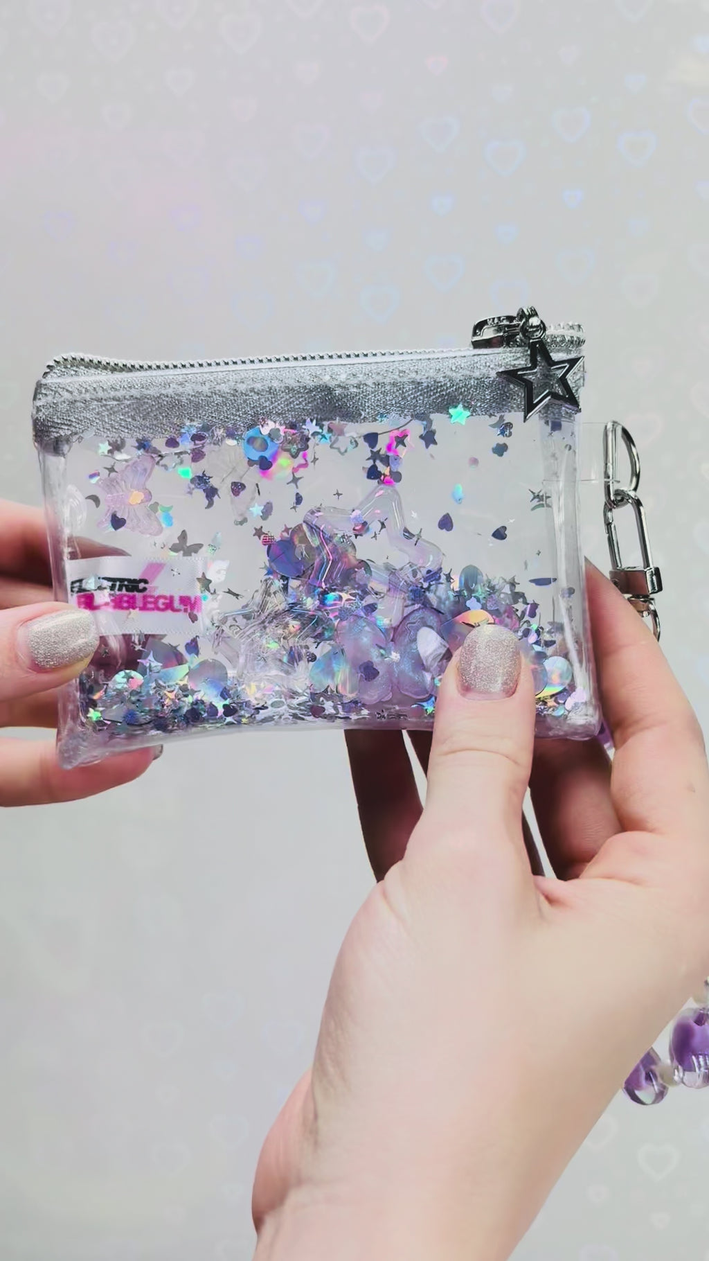 Meet your pocket-sized portal to the Electric Bubbleverse. This Digital Diva Coin Purse shimmers with floating holographic, iridescent, and purple glitter with large stars, hearts, and butterflies drifting alongside smaller moons, stars, hearts, and fluttering butterflies for a super cute cyber kawaii vibe.