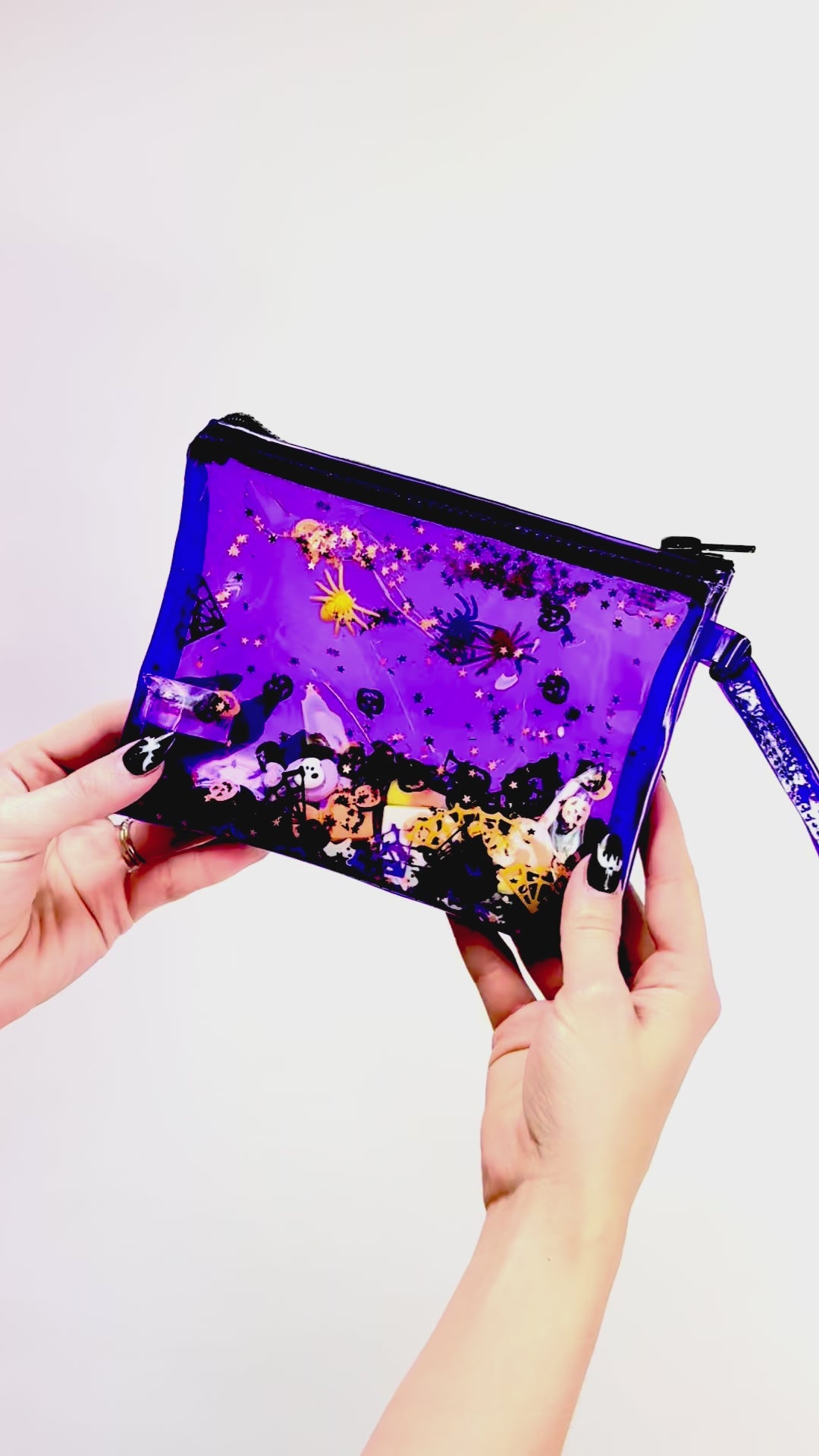 Sweeten up spooky season with the Liquid Glitter Wristlet โ Trick or Treat! This 7 x 5 inch cutie is made of purple vinyl and filled with swirling liquid glitter and floating Halloween candies.