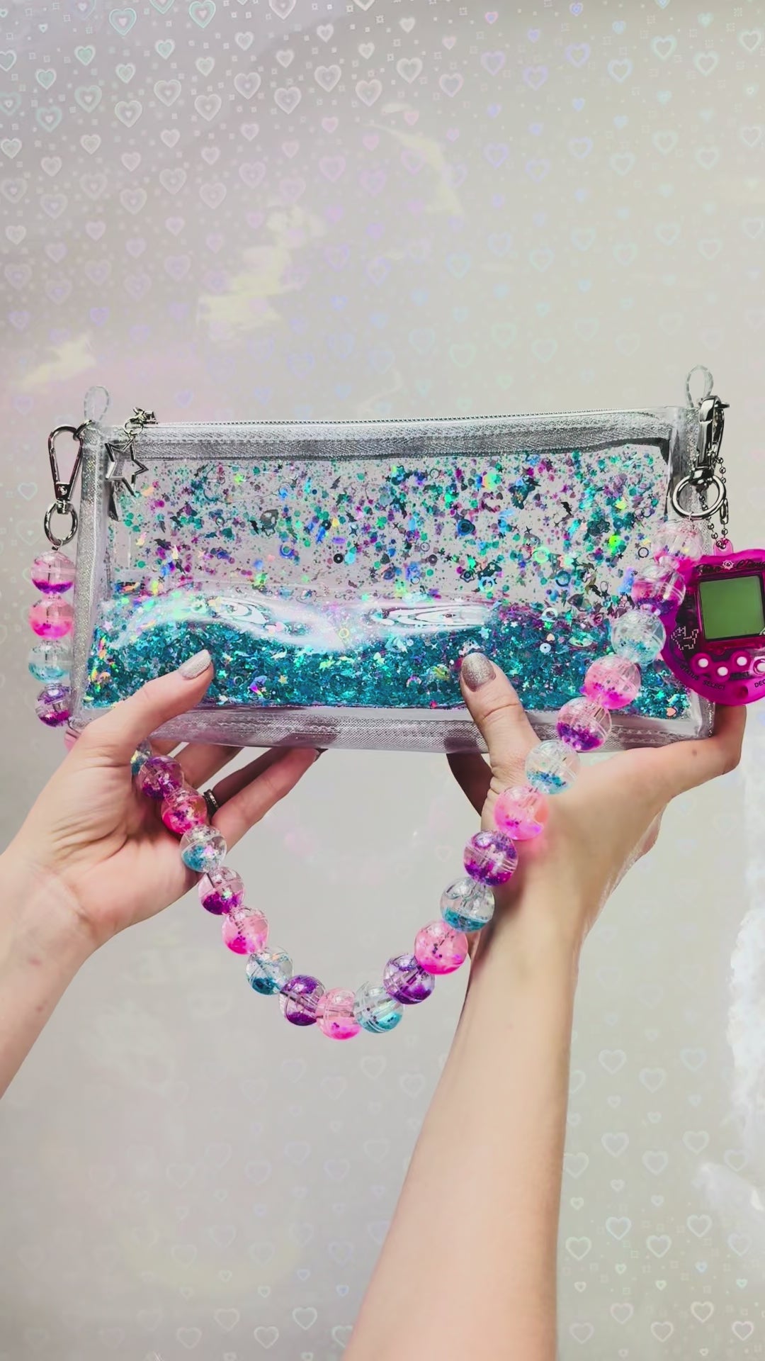 The purse has one main pocket and closes with a sparkle silver zipper and silver star pull. This style includes two removable straps, but the liquid glitter bead chain truly steals the show. Each bead is filled with swirling liquid glitter, and the colors alternate in pink, blue, and purple, creating a glowing, animated look that feels straight out of a digital world. The second strap, a silver holographic pixel shoulder strap, offers a more classic option when you want to switch up the vibe. A pink digital pet keychain on the outside adds the perfect final touch.