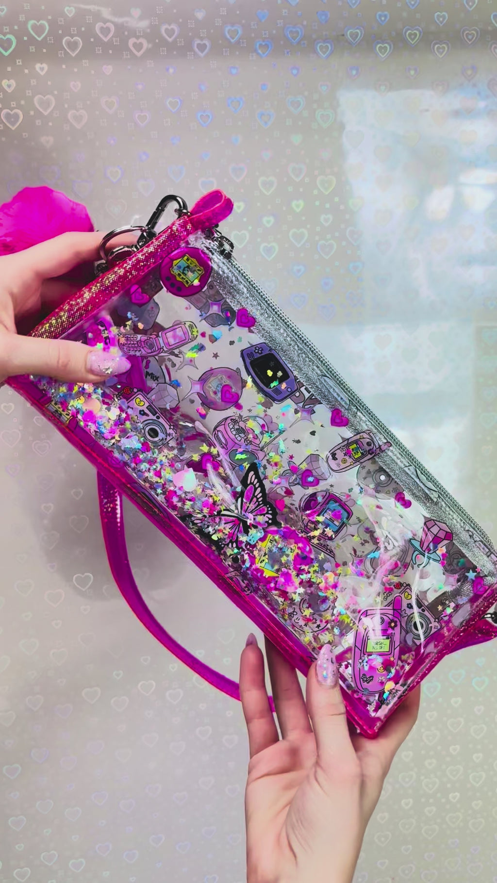 Vinyl - Clear Y2K print front & back & Holographic pink pixel sides & strap