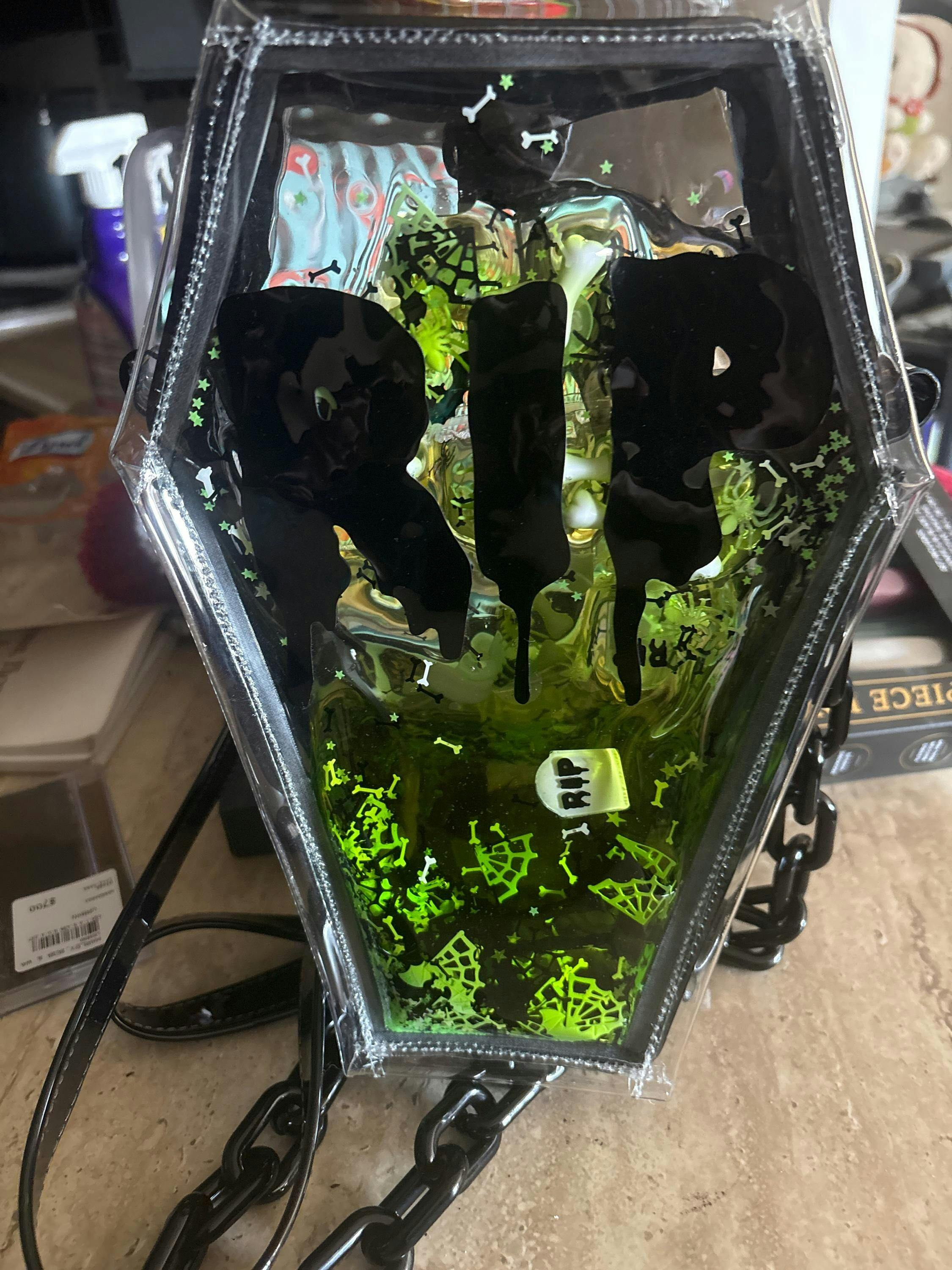 This backpack is filled with night of the living dead glitter goo!! It's shaped like a coffin and can be used as a backpack or a crossbody purse! Features glow in the dark glitter goo on the front and a glitter goo pocket on the back of the bag. Glitter goo is made up of skeletons, gravestones, bones, spiders, bats, webs and stars. Gravestones, spiders and stars glow in the dark. Backpack is made of clear and black vinyl and features a RIP across the front! Purse closes with a black zipper that has a cute little star pull. Comes with black backpack straps and a black crossbody chain strap that are all removable and adjustable.