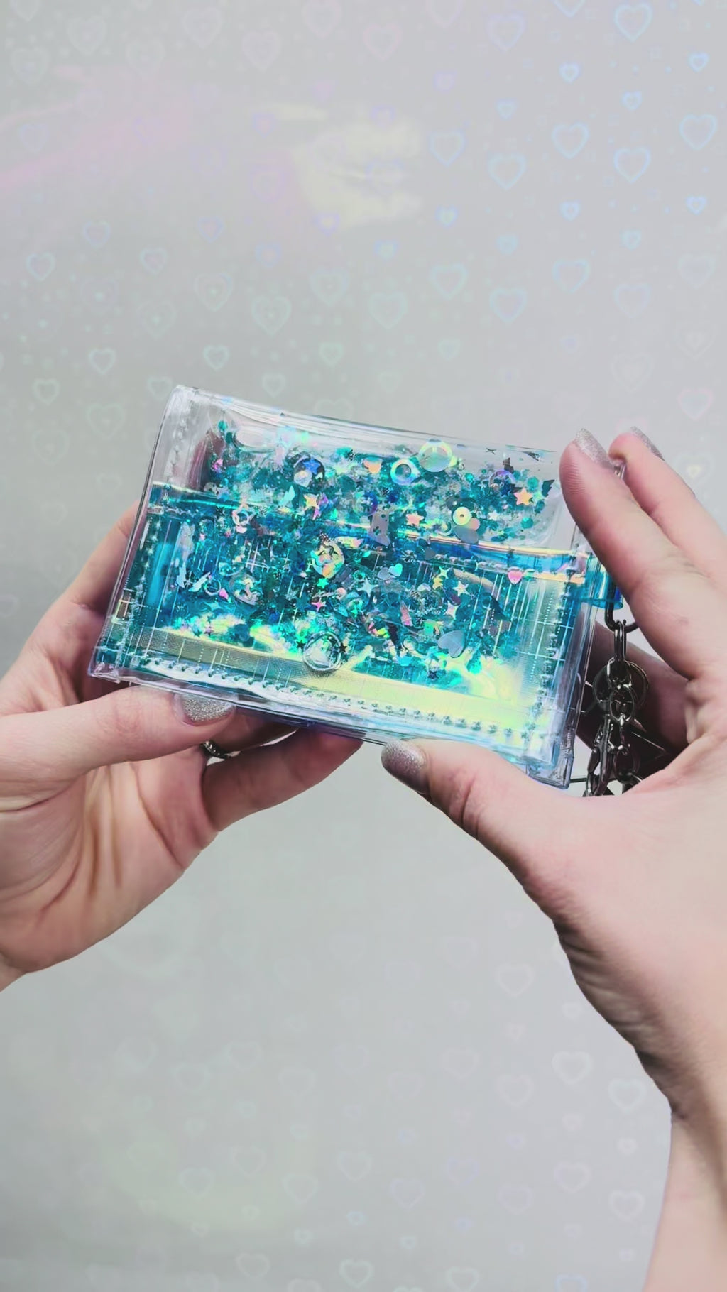 Add a burst of cyber digital sparkle to your essentials with the Pixel Pop Tiny Wallet. Clear vinyl on the outside shows off the mesmerizing glitter goo floating around. Filled with blue iridescent and holographic silver glitter shapes like alien heads, gamer controllers, hearts, stars, dots, hexagons, moons and lightning bolts. The card slots feature blue digital vinyl for a techy, pixel-coded touch that ties the wallet into its cute cyber aesthetic.