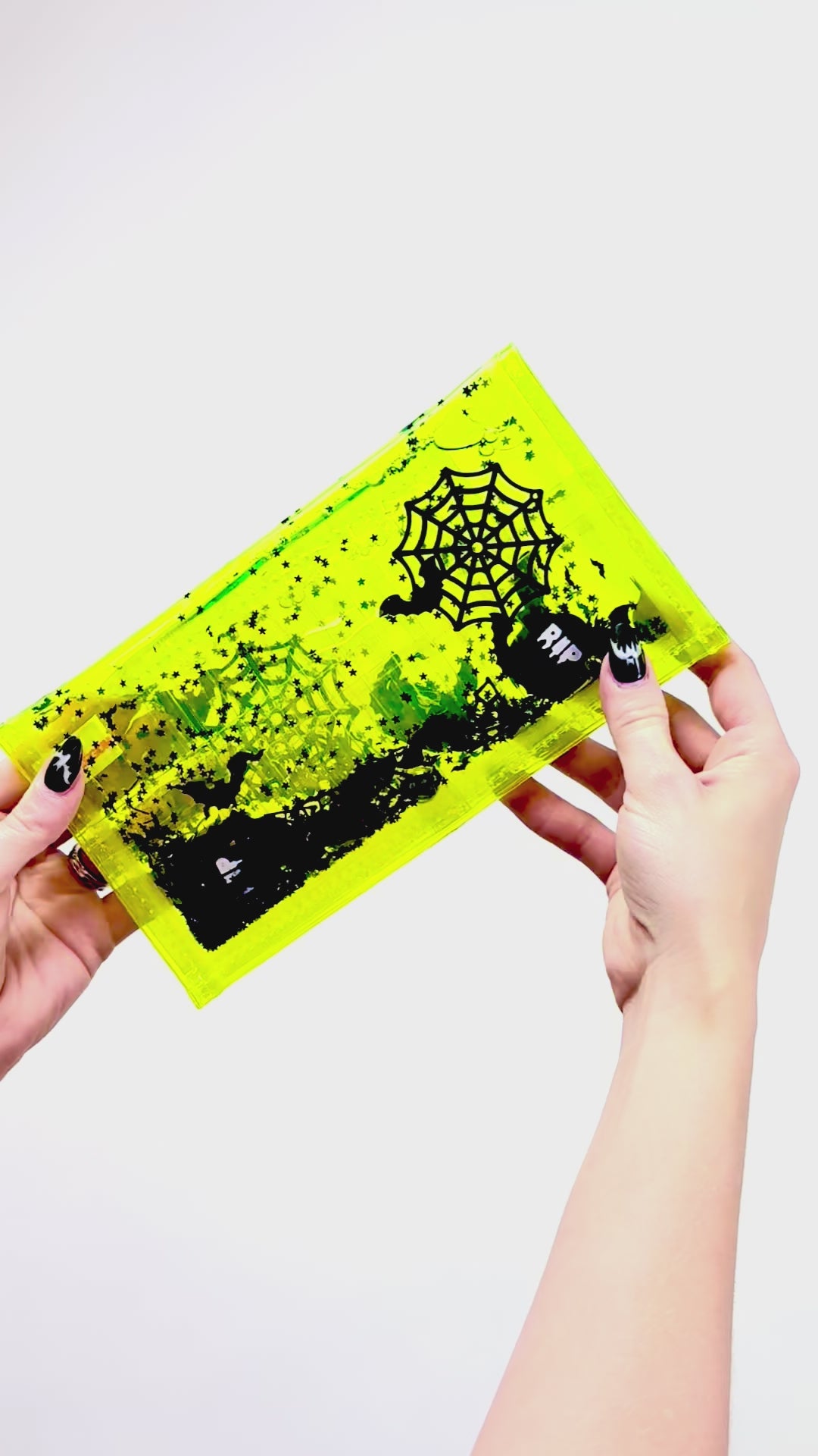 Make storing your cards and money fun and spooky with this electric, liquid glitter wallet! This halloween liquid glitter wallet is here to meet all of your spooky needs! This wallet is made of neon yellow vinyl that glows in UV light. It is filled with spooky liquid glitter that consists of webs, bats, gravestones and stars. Wallet has 10 card slots on one side and 2 cash slots on the other side and closes with a snap.