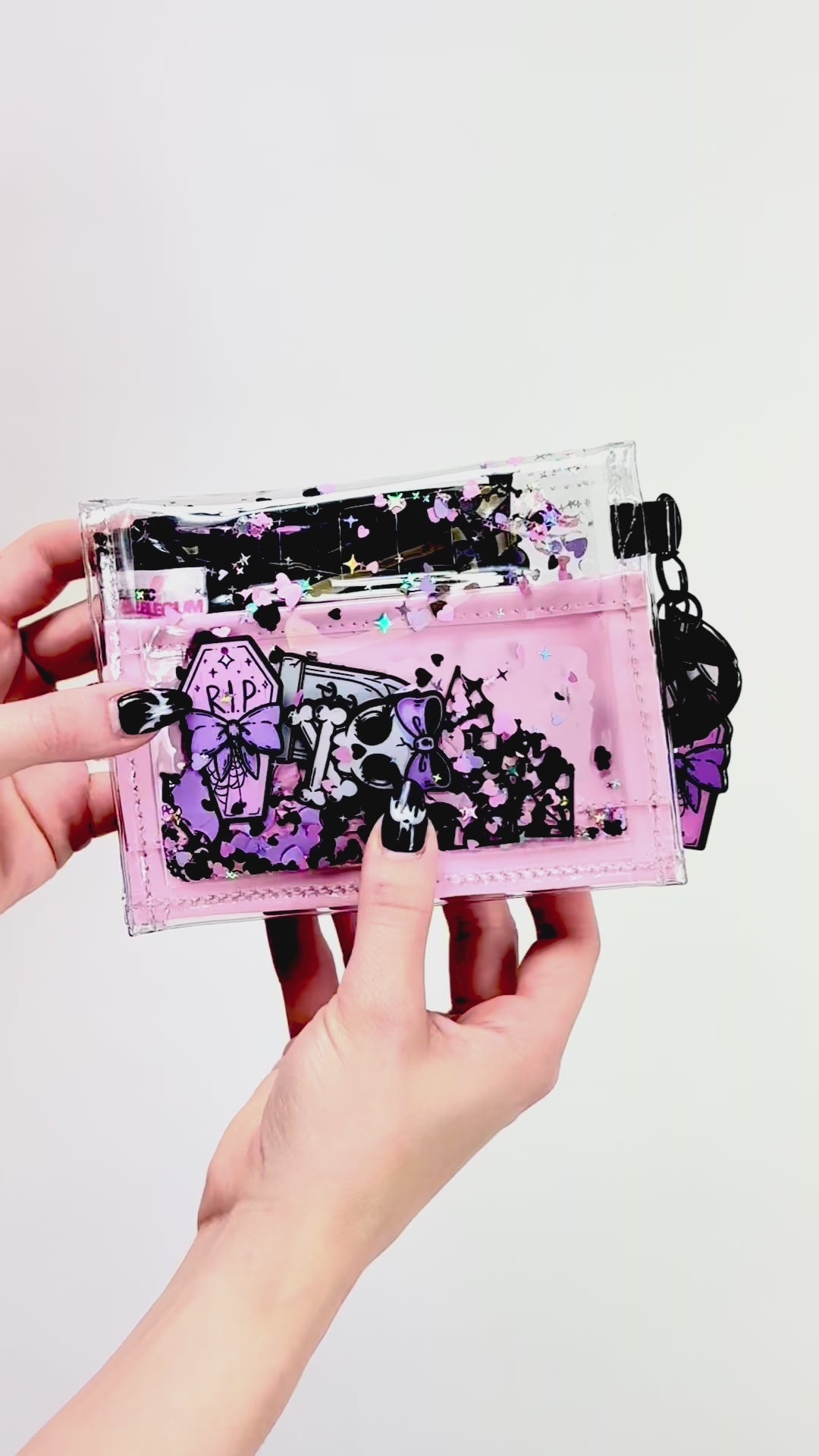 This wallet is filled with ghoulish vibes! It is made of clear vinyl with black and pink card slots on the inside. The outside is filled with liquid glitter that swirls around. It is made up of ghoul charms, webs, bats, skulls, hearts and stars! The wallet has 5 card slots and 3 wider slots for cash (folded in half). It has a snap closure and a keychain hook on the side.
