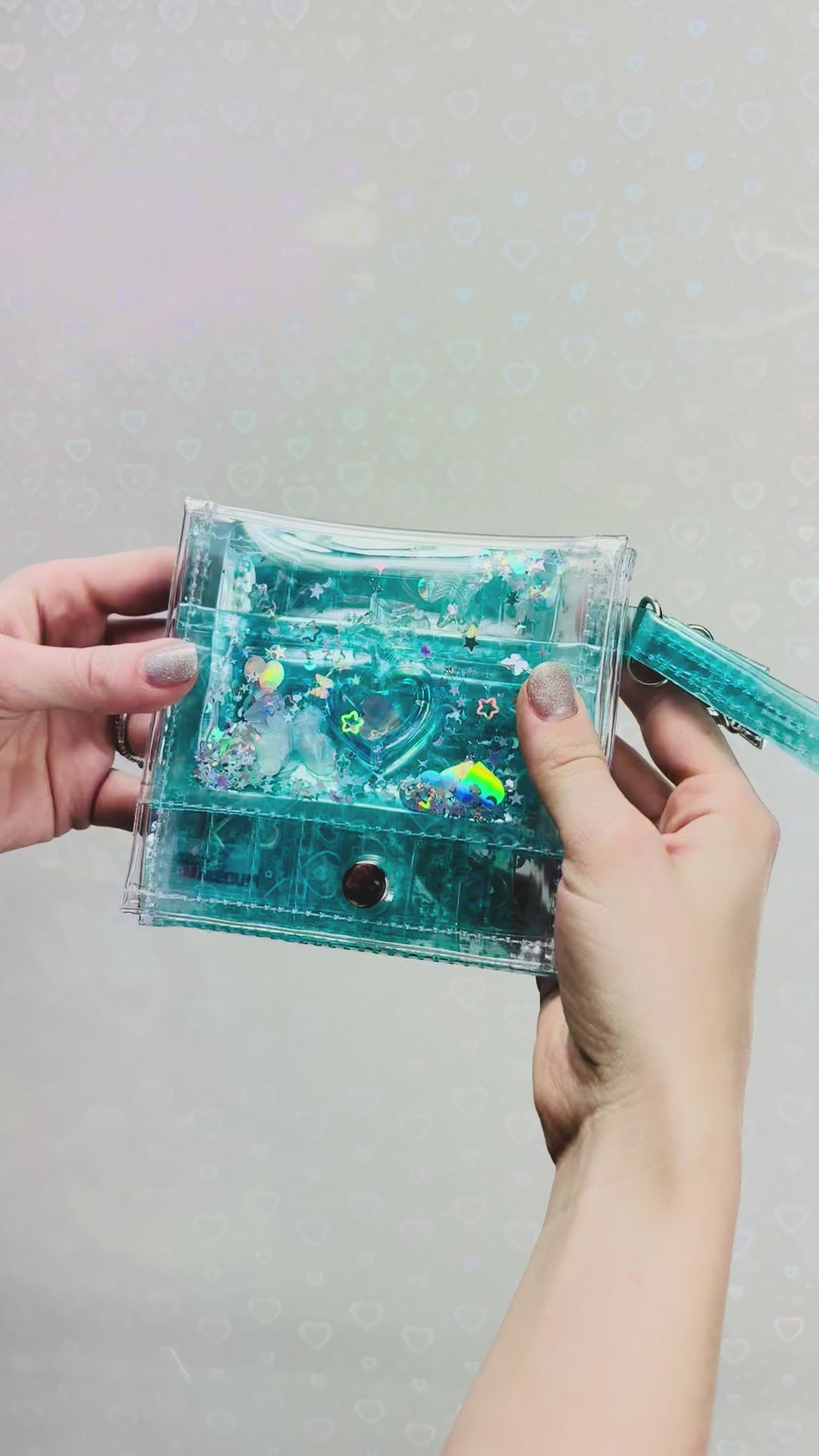 Your essentials just leveled up. The Cyber Crush Mini Wristlet Wallet is designed for quick trips, casual quests, and everyday sparkle. Itโs a compact companion straight from the Electric Bubbleverse. Its clear vinyl exterior reveals a shimmering liquid glitter on the outside, where hearts, stars, and butterflies drift around.
