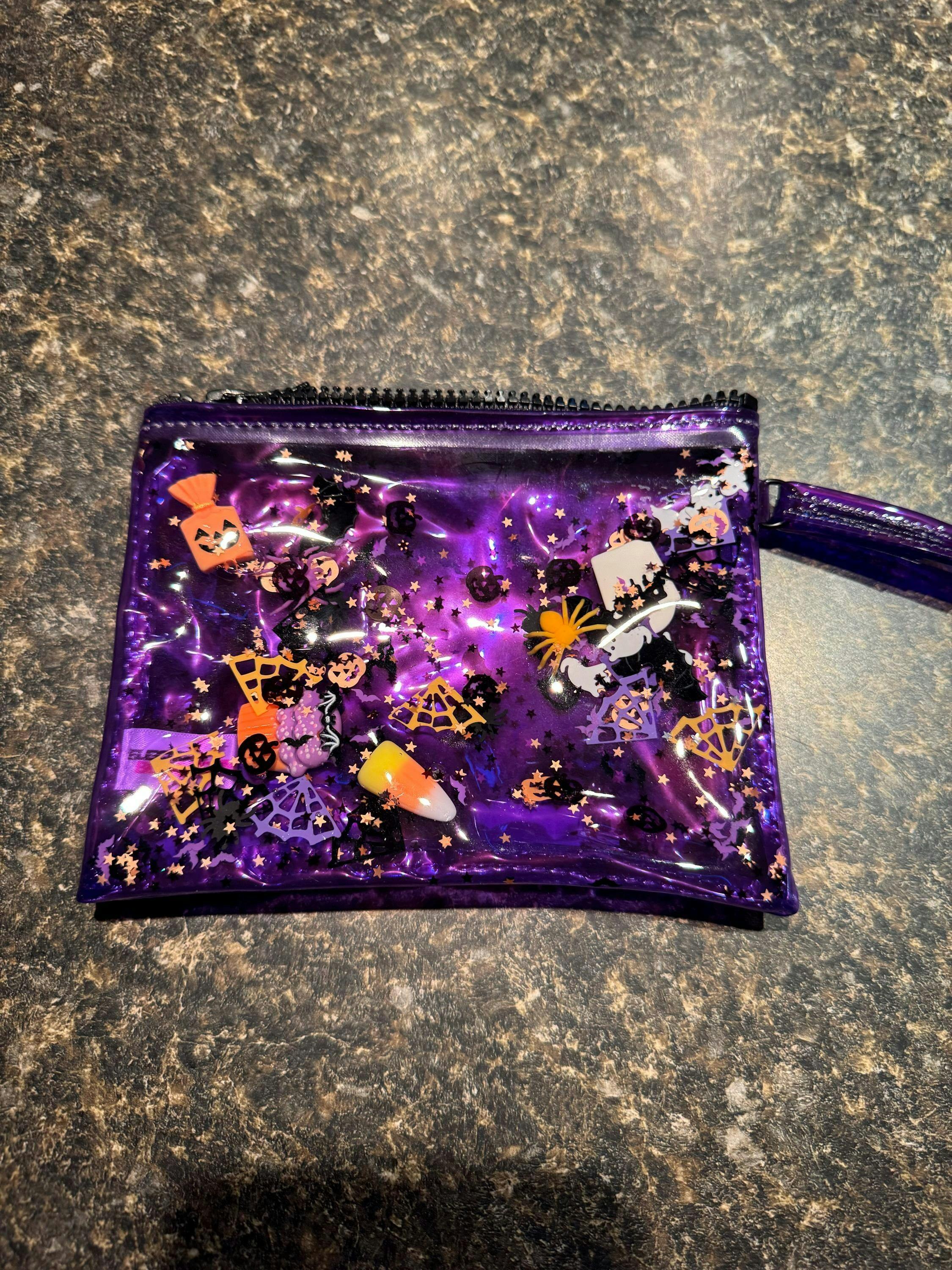 Sweeten up spooky season with the Liquid Glitter Wristlet โ Trick or Treat! This 7 x 5 inch cutie is made of purple vinyl and filled with swirling liquid glitter and floating Halloween candies.