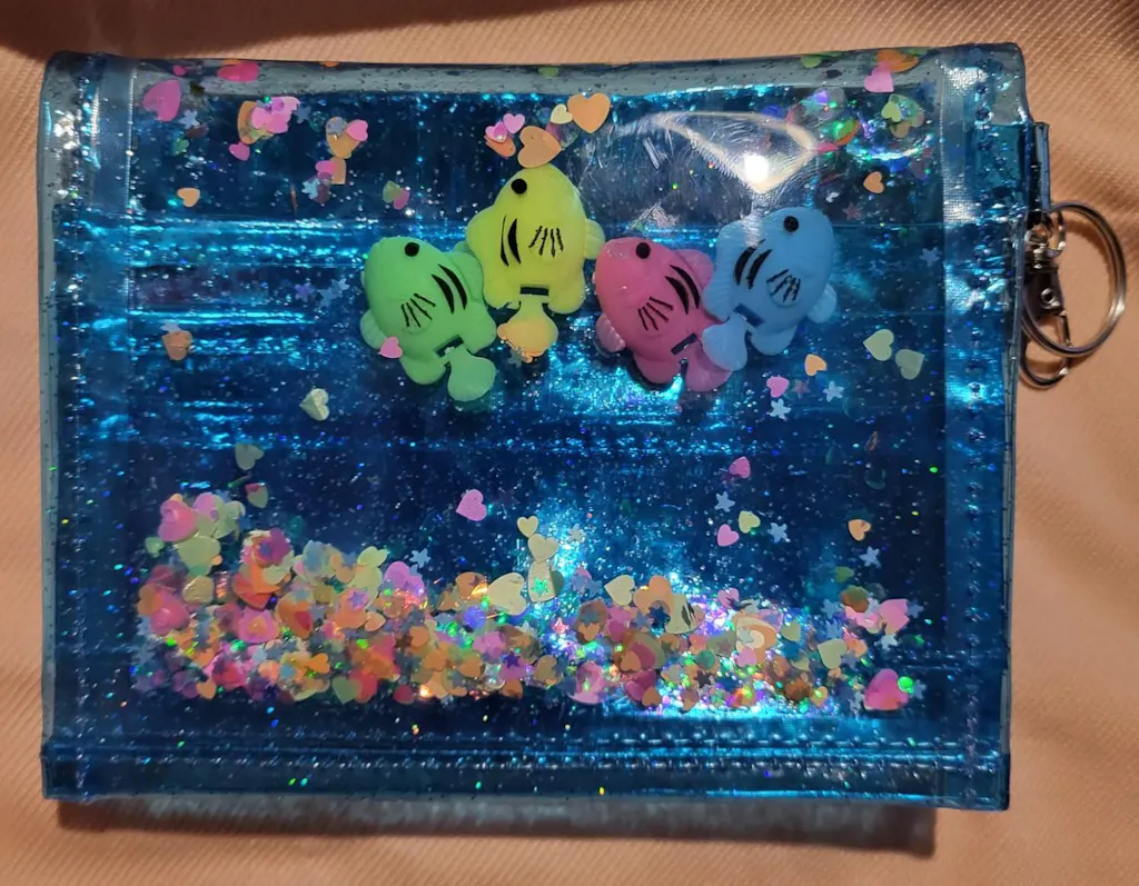 Add a little fun to your life with a liquid glitter wallet! Enjoy endless fun moving the floating glitter around on the front and back of the wallet. Wallet features sparkly blue vinyl with tropical fish liquid glitter floating within. This wallet has 5 card slots and 3 wider slots for cash (folded in half) and anything else! The vinyl is durable and has a snap closure. Wallet also features a silver keychain hook on the side.