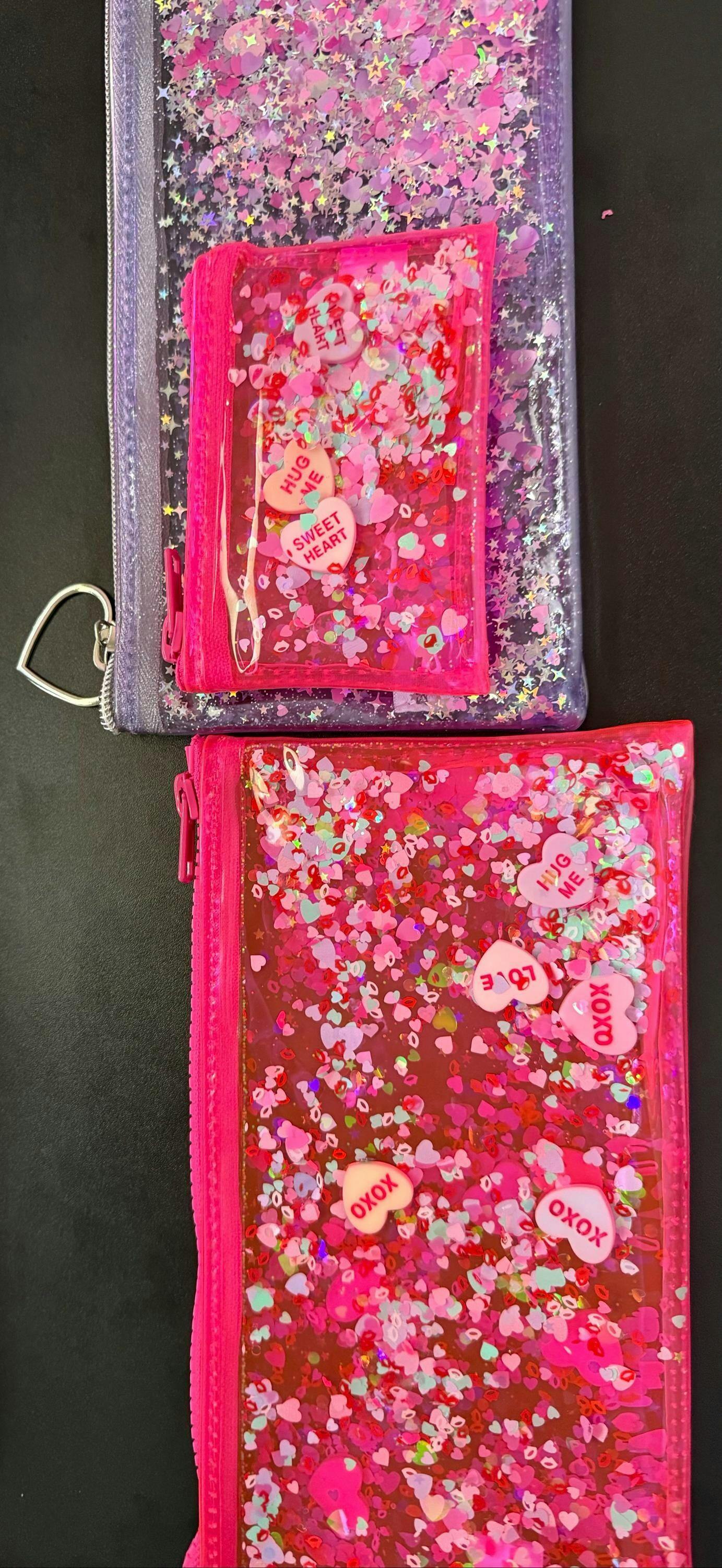 The funnest way to store your school, office or art supplies! This liquid glitter pencil case features glitter vinyl, a silver metallic zipper and is filled with liquid and glitter that moves all around! The vinyl is durable to prevent popping and is made to last. It is endlessly entertaining to move glitter around and is the sparkliest way to store you pens and pencils! Liquid glitter features tiny unicorns, hearts and stars!