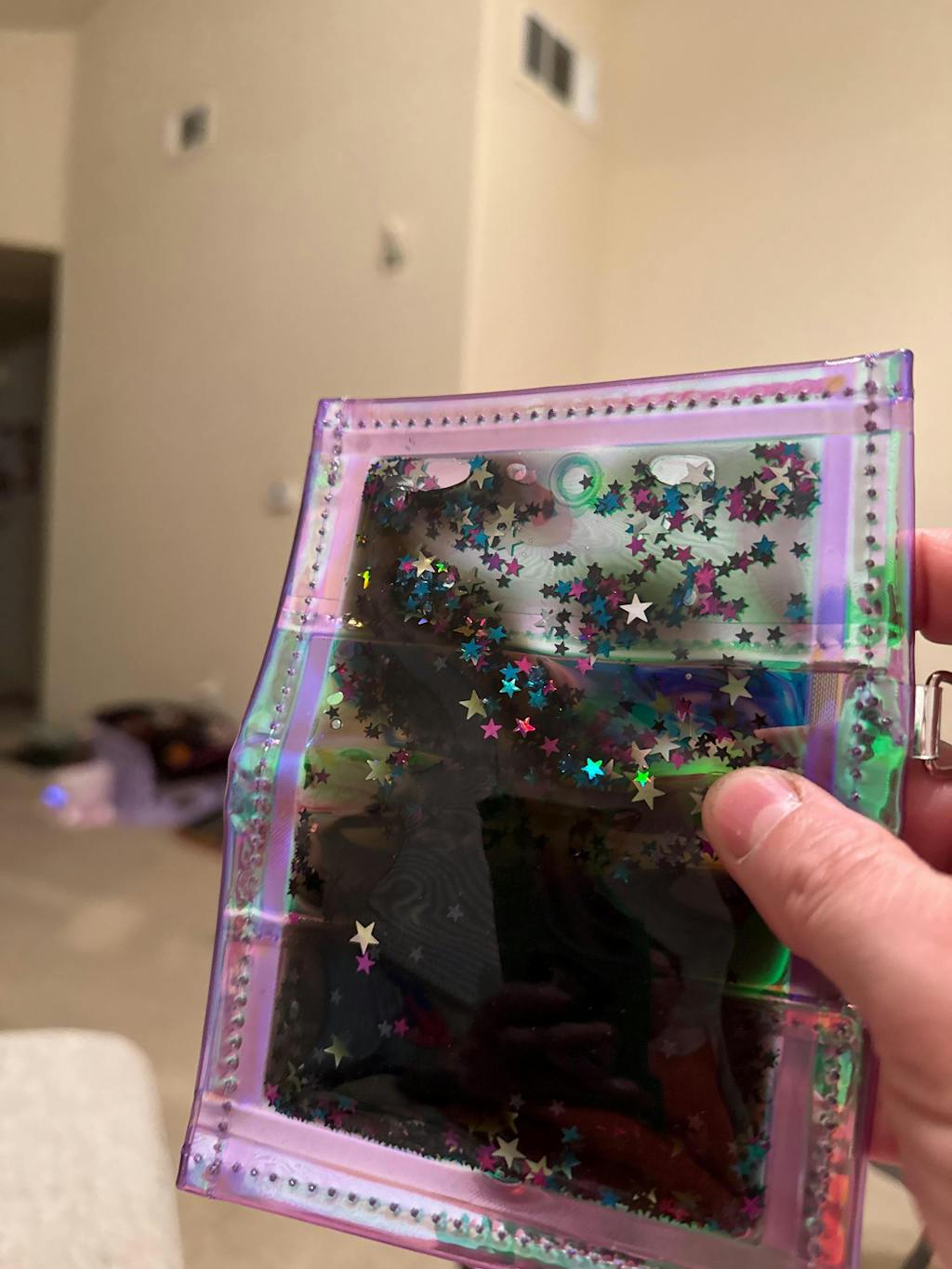 Need that perfect teeny tiny wallet when you don't want to lug around a lot of stuff? This is it! Its perfect for just storing the essential cards and it is made out of iridescent purple vinyl filled with cute liquid glitter that floats all around. Features silver card slots and snap closure on inside and a star keychain hook it to your keys.