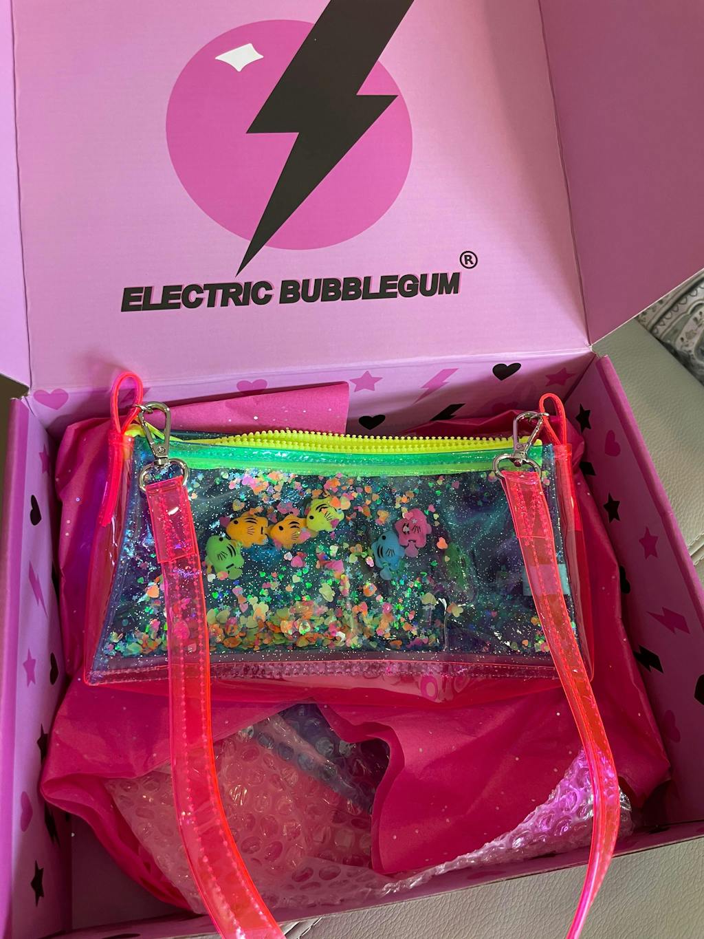 Filled with summertime happiness! This little mini purse is has liquid glitter floating around on the front and back. Liquid glitter is made up of tropical fish, hearts and starfish. This purse is 10in x 4.5in x 2in in size and closes with a neon yellow, plastic zipper. It has a 24inch pink neon shoulder strap that is removable. This purse is perfect for storing the essentials!