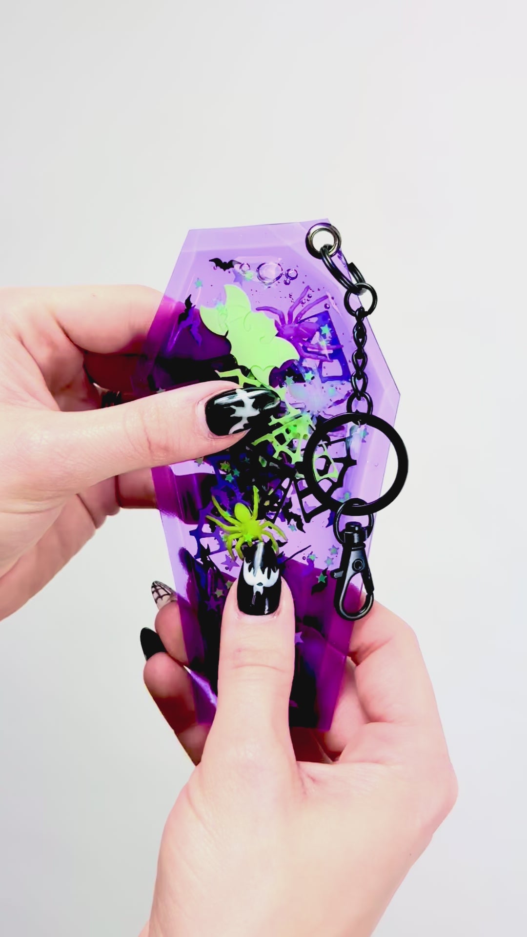 Add some fright to your keys, backpack, or purse with a spooky, liquid glitter keychain. Made of durable purple vinyl, this coffin shaped keychain is filled with liquid and glitter that float around throughout the plastic. It is filled with bats, webs, spiders and stars that float around. It is as mesmerizing to look at as it is to push around and play with! Also, features a black metal keychain hook