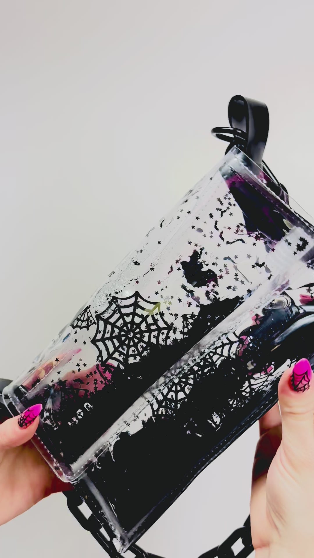 Loads of spooky wrapped up into this little bag! Made of clear and black vinyl with spooky liquid glitter on the front and back that move all around, this little purse will provide you with endless spooky halloween vibes. The liquid glitter is made up of black bats, stars, webs and gravestones in clear liquid. This mini purse has a chunky, black plastic chain and a slip pocket on the back. Closes with clear lock tight velcro.